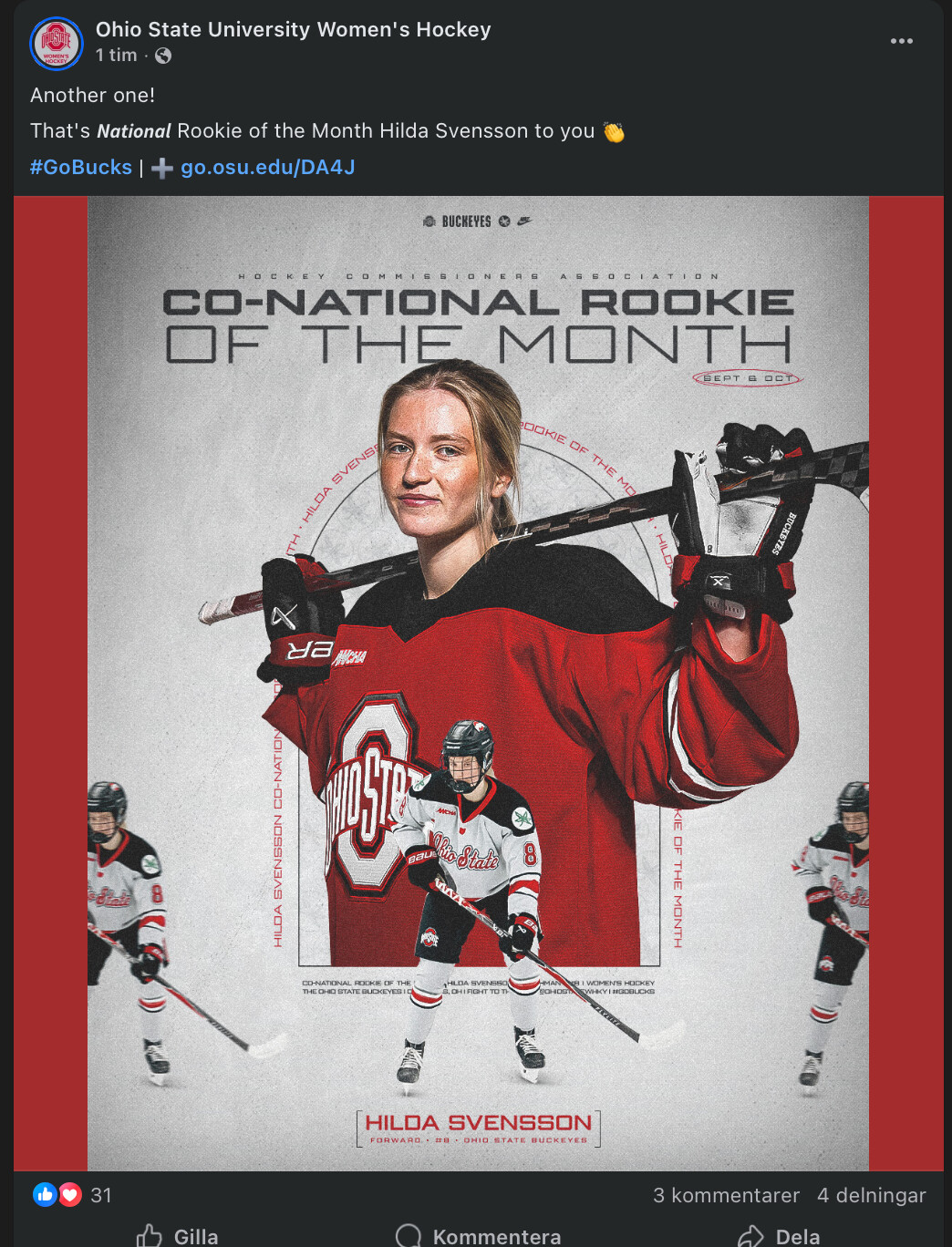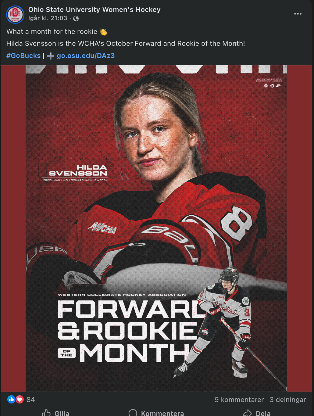 Inlägg på Ohios FB från igår och förrgår. Kul med framgångar för Hilda over there! Och även då igår med landslaget. Grattis och kämpa på mot PWHL!