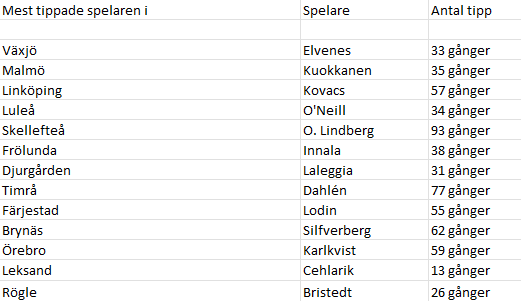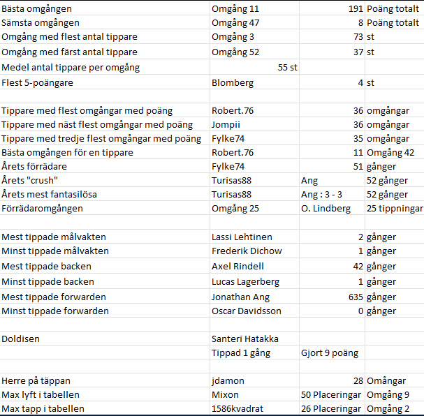 Stort tack till @Goddamn som roddat och fixat allt med tippet. Stort plus för tabellen/statistiken där man kunnat följa utvecklingen och förändringarna efter varje omgång. Leise lär vara avundsjuk.