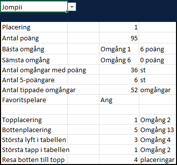 Statistiken här plockas ut automatiskt, jag garanterar inte på något sätt att den stämmer då jag senast igår hittade ett litet fel. Det kan också vara som så att det finns många lika resultat i statisistiken, då väljer Excel efter bokstavsordning eller om det är raden som den hittar först. Lite osäker på det.