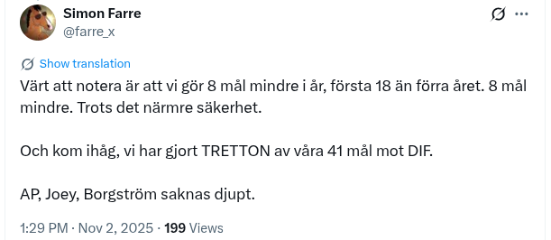 Men räknar vi bort Hävelid målen så blir det 1.75 mål per match. Inge vidare och speglar kanske verkligheten bättre än de “dopade” 2.28…
