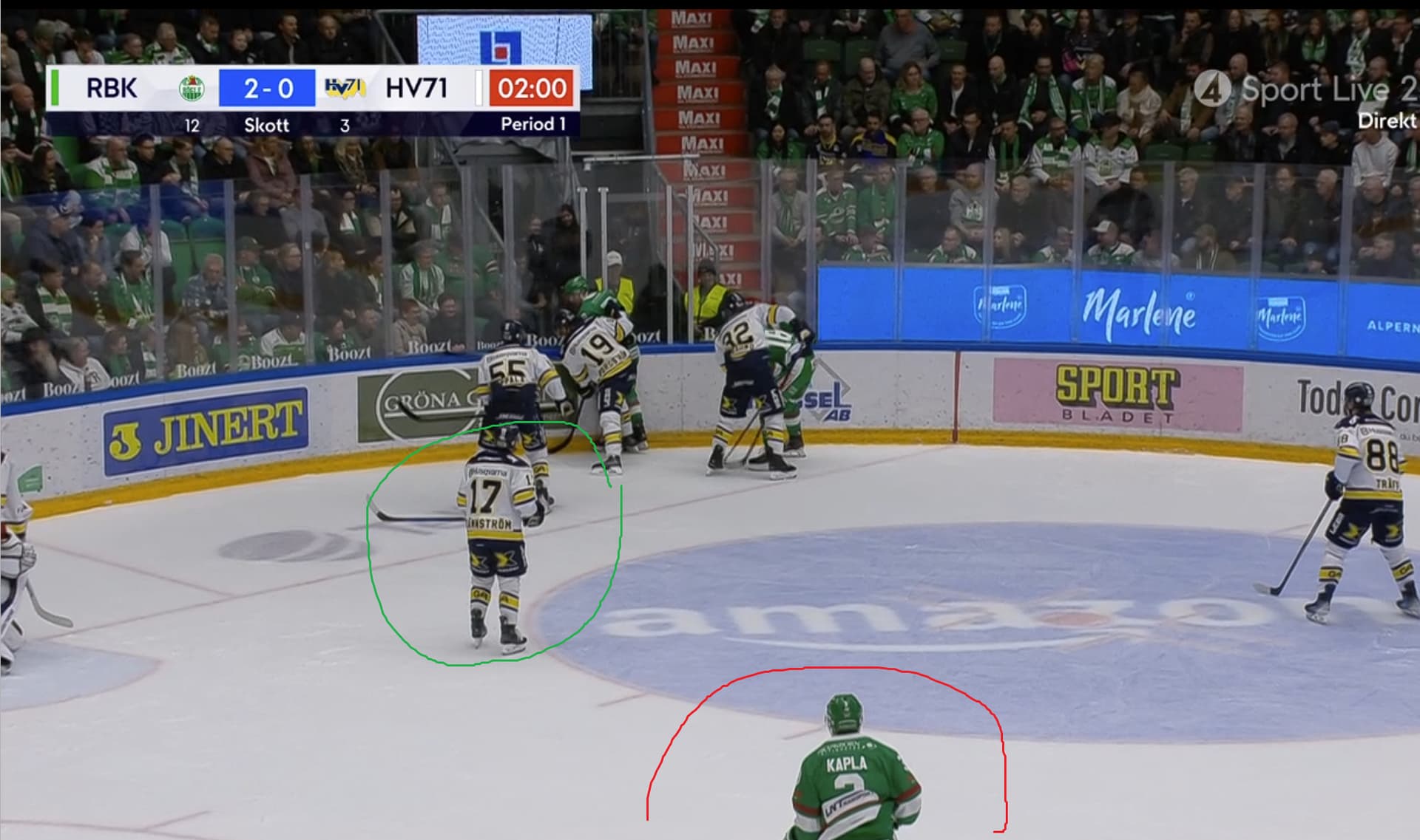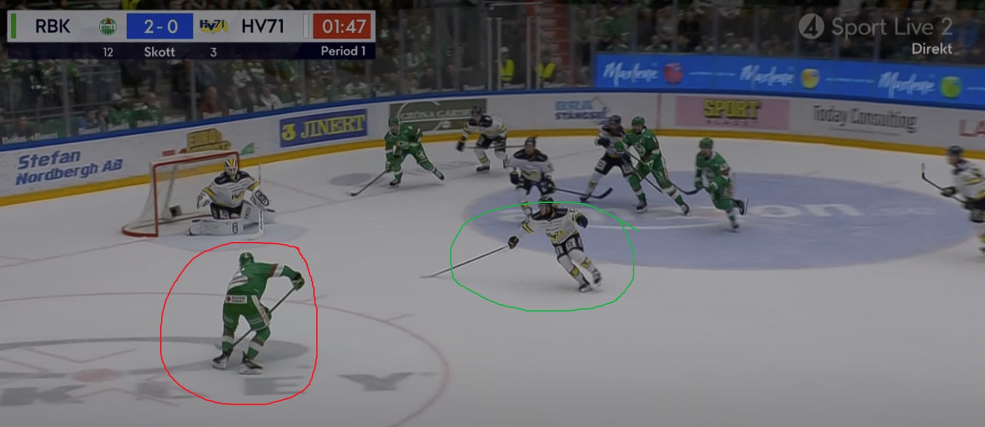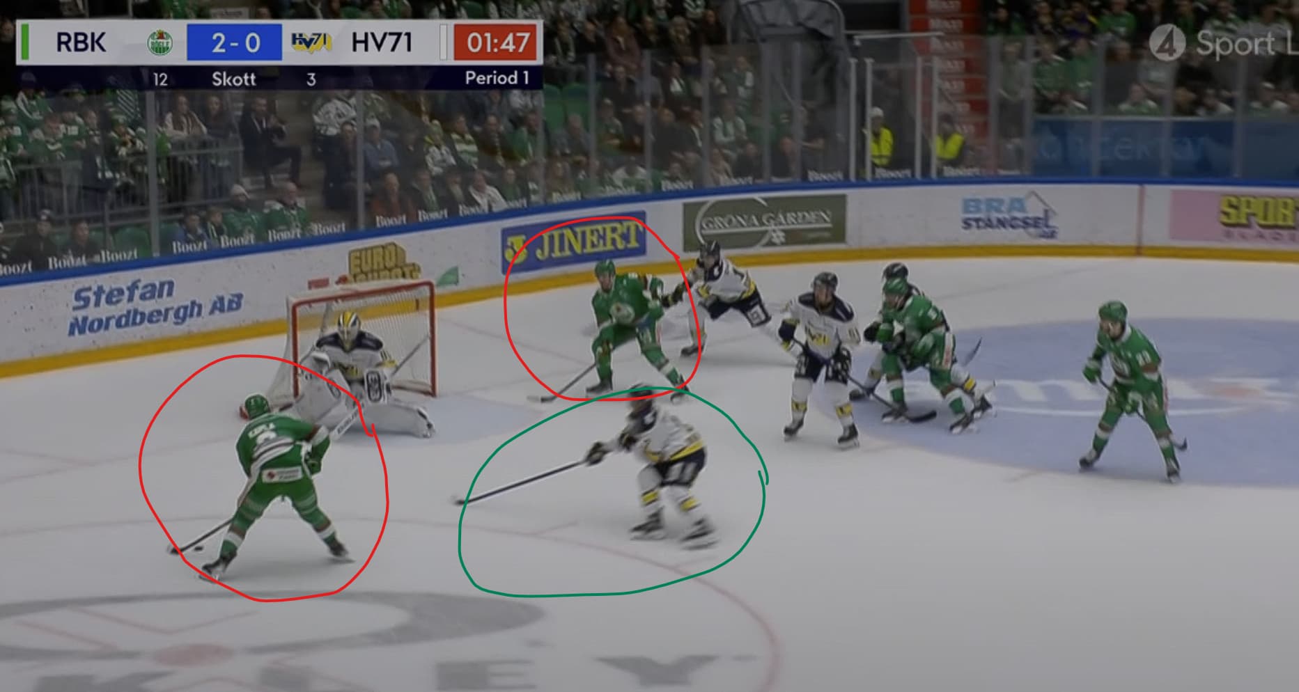Gillar inte alls Brännströms placering, men också dåligt att de två Rögle-spelarna kommer ut med pucken så lätt mot 3 HV-spelarna