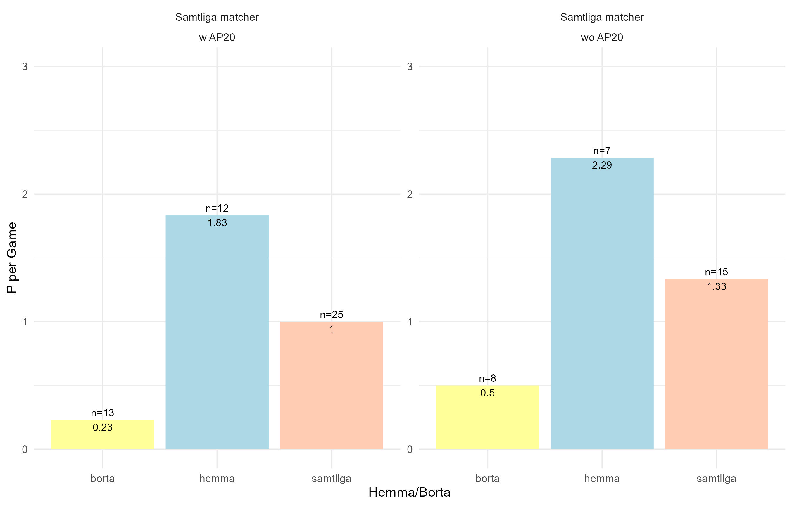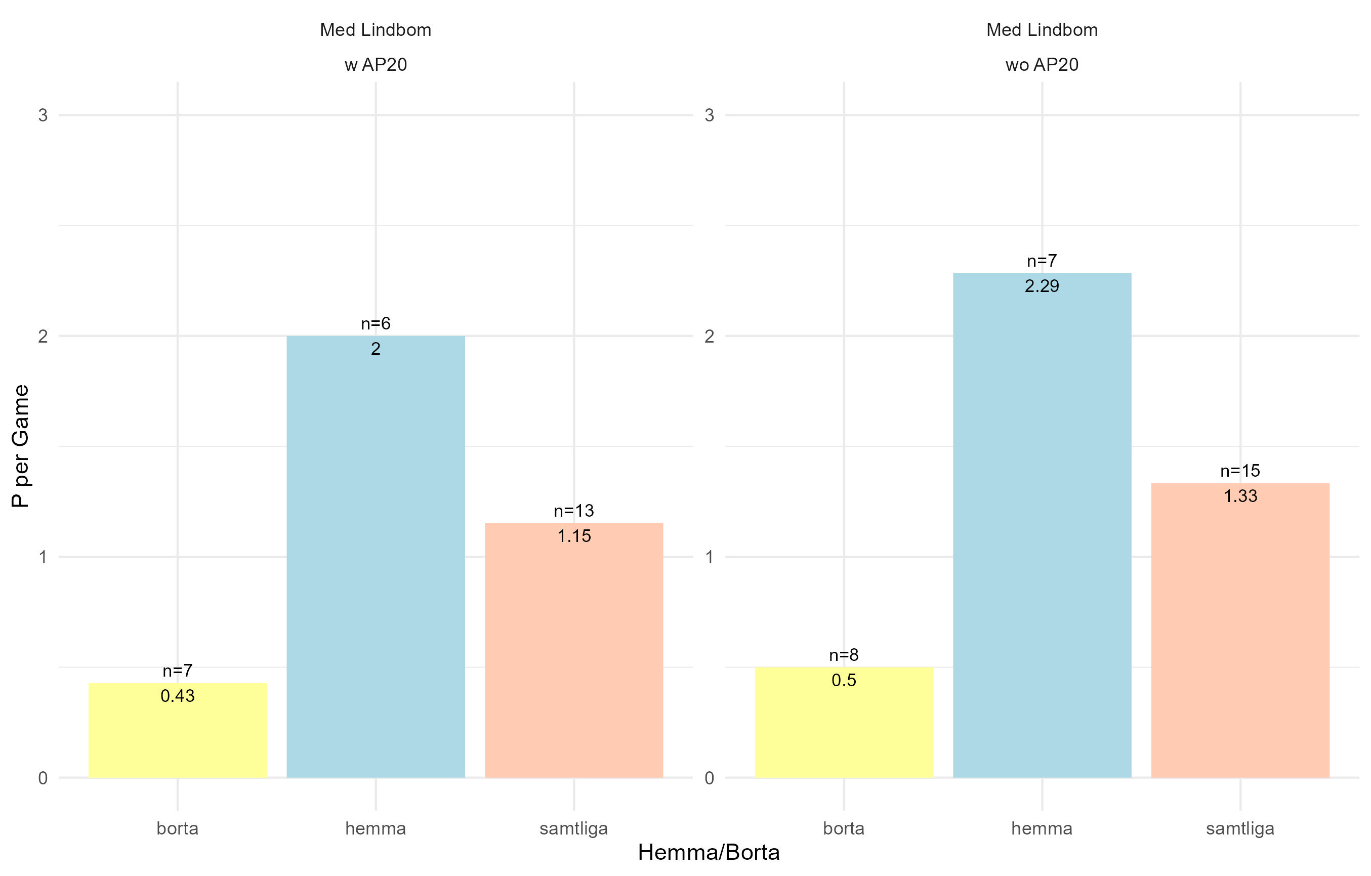 Roade mig med att titta på HV:s poängsnitt när AP varit med/inte varit med i laget. I den första grafen syns lagets poängsnitt med Lindbom som coach. Med André i laget har vi ett poängsnitt som är 2p hemma, 0,43p borta och 1,15p totalt. När André inte varit med är poängsnittet 2,29p hemma, 0,5p borta och 1,33p totalt.