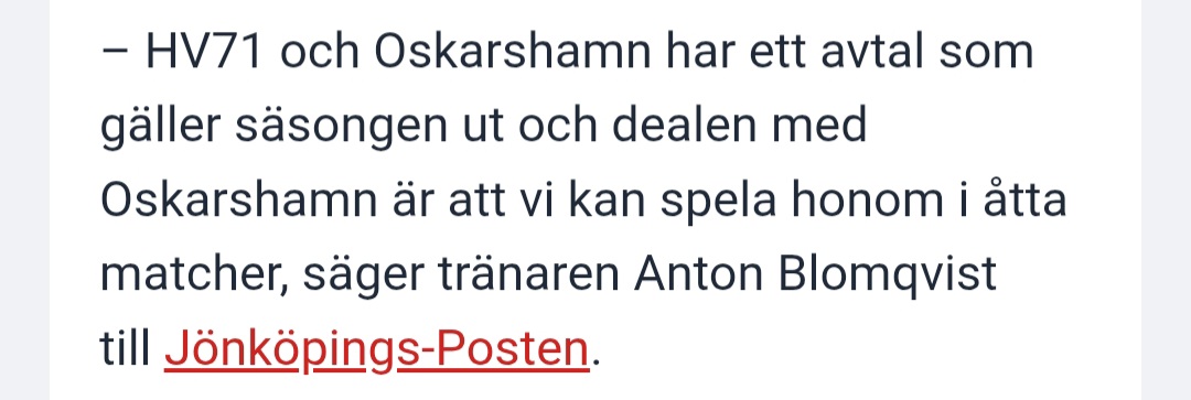 Han har väl inte missat någon match med Oskarshamn eftersom att man spelat varannan dag med respektive lag, samtidigt som Hv gått ut med att man spelat Olof i 4 eller 5 matcher och enbart har 4 alternativt 3 matcher kvar att nyttja honom.