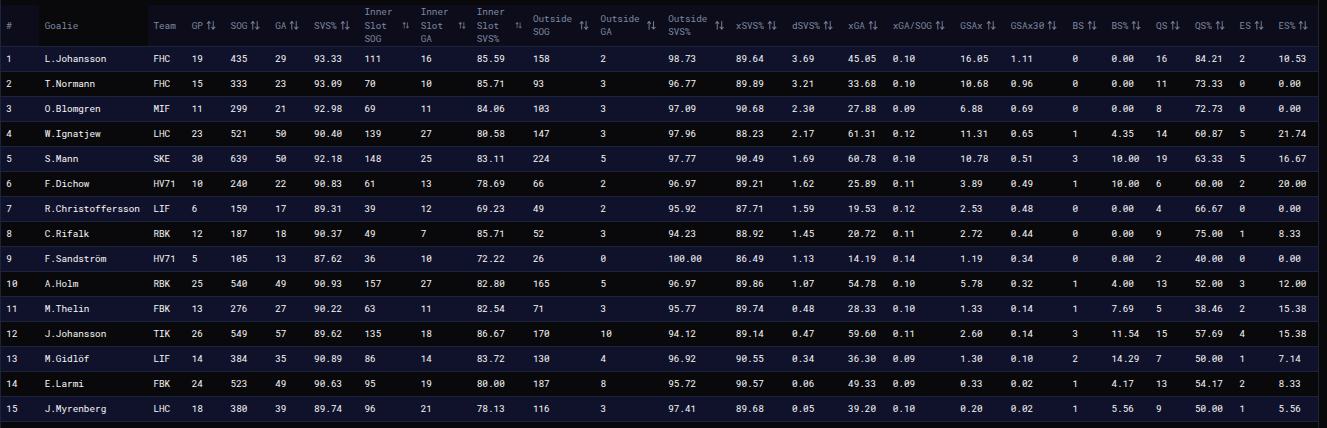 Målvakter i SHL rankade efter Goal Saves Above Expected / 30 shots.