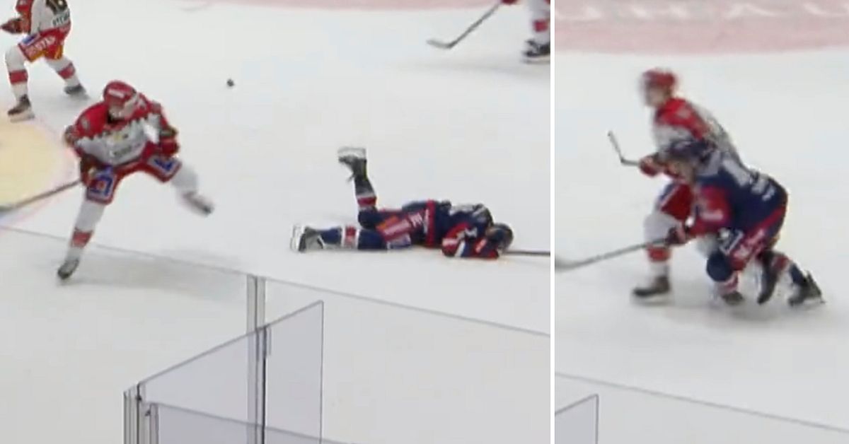 Lodin hoppar in i en tackling som är millimetrar från att träffa Sjöholm i huvudet och i bästa fall bara avsluta den här säsongen för honom. 2 minuter, för “den träffade inte i huvudet”.