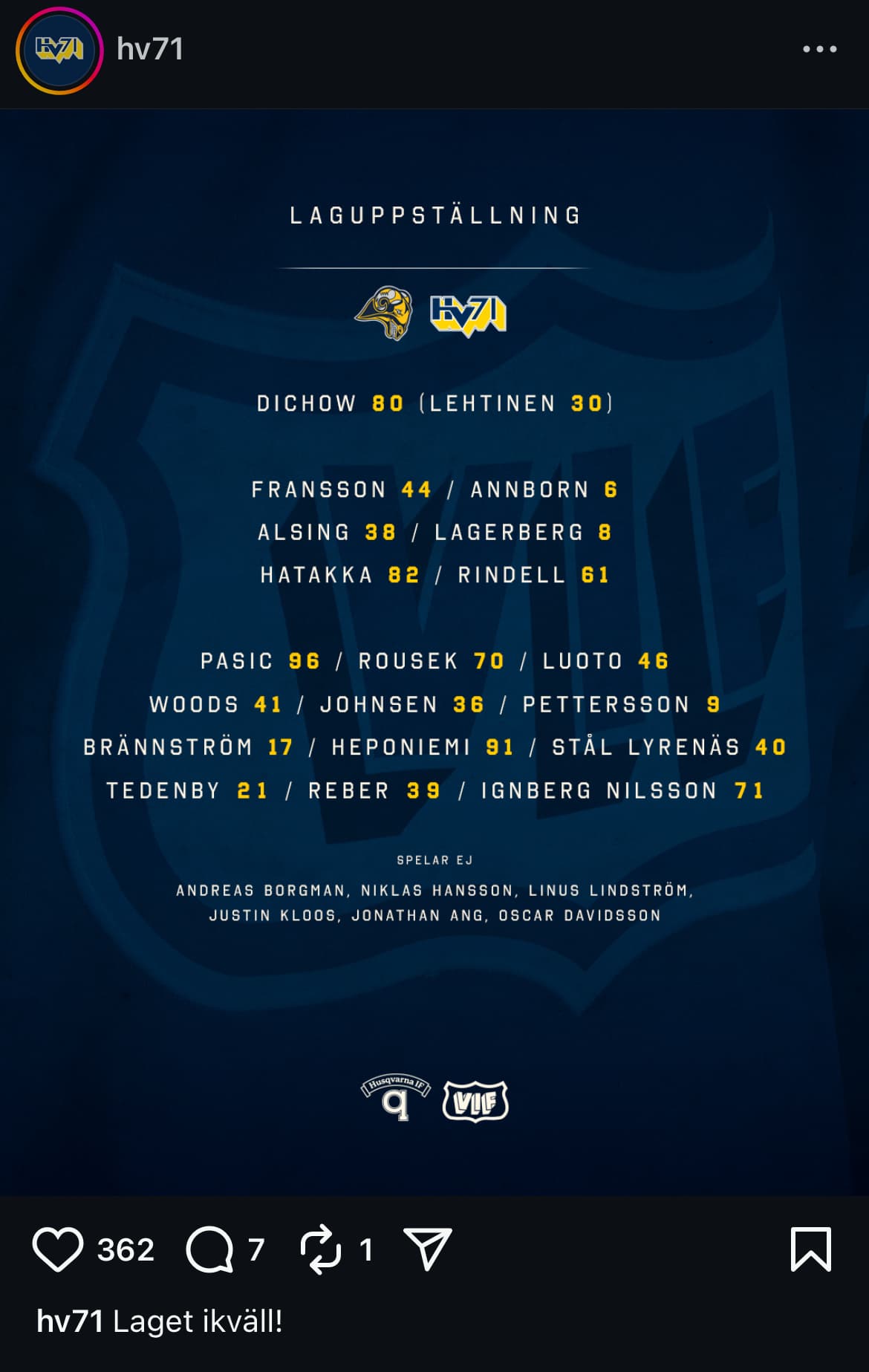 Hoppas Lagerberg får mycket istid och kan bevisa att Frölundamatchen inte va ett undantag. Vill också se Woods och Rousek göra poäng!